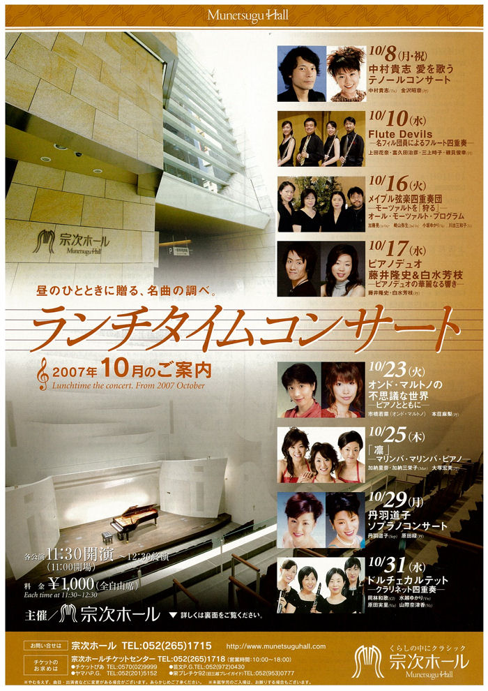 | 会場 | 宗次ホール TEL:052-265-1715 HP:http://www.munetsuguhall.com |