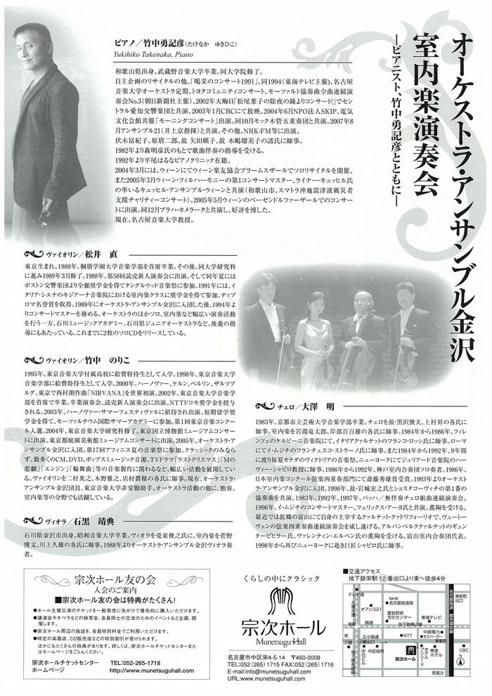 | 出演 | 竹中勇記彦(Pf) 松井 直(Vn)、竹中のりこ(Vn)、石黒靖典(Va)、大澤 明(Vn) |