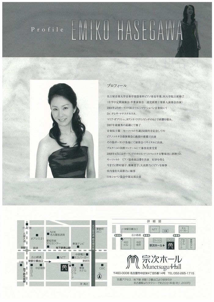 | 会場 | 宗次ホール 名古屋市中区栄4丁目5番14号 TEL:052-265-1715 地下鉄栄駅 12番出口より徒歩5分 名古屋駅よりタクシーで約20分 |