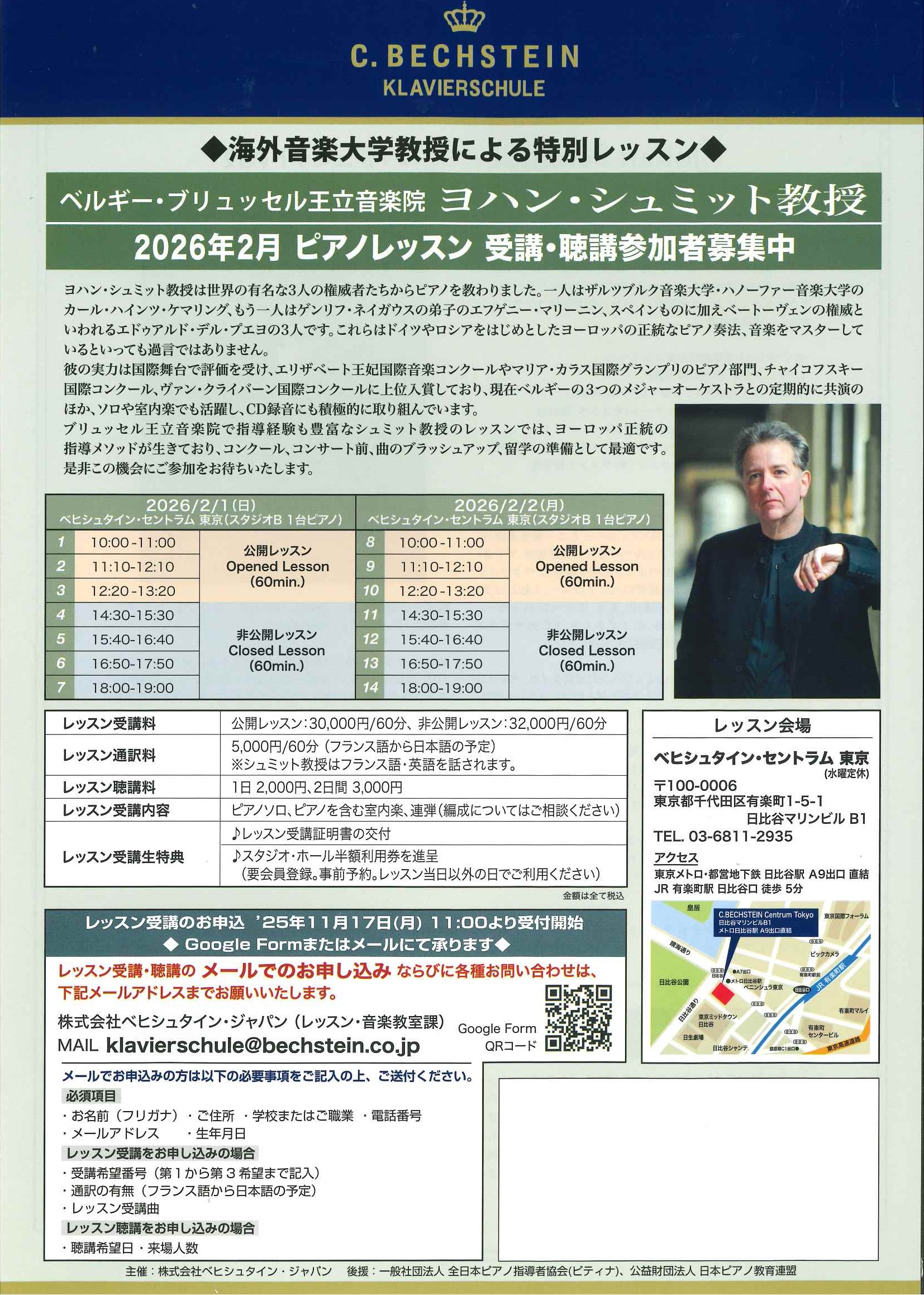 【Pf】ヨハン・シュミット教授 ピアノレッスン受講・聴講参加者募集