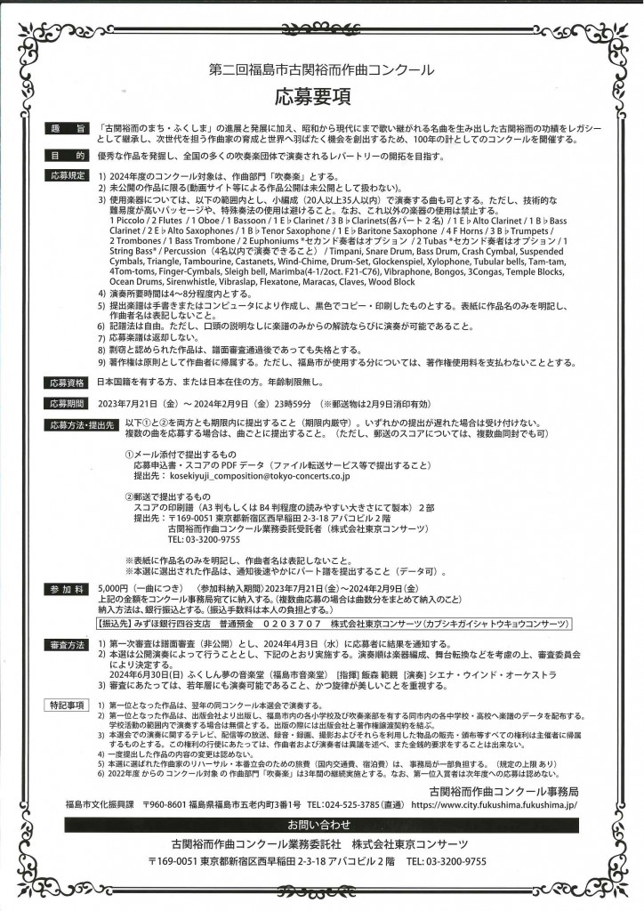 【作曲】2024年 第二回 福島市古関裕而作曲コンクール 吹奏楽作品募集