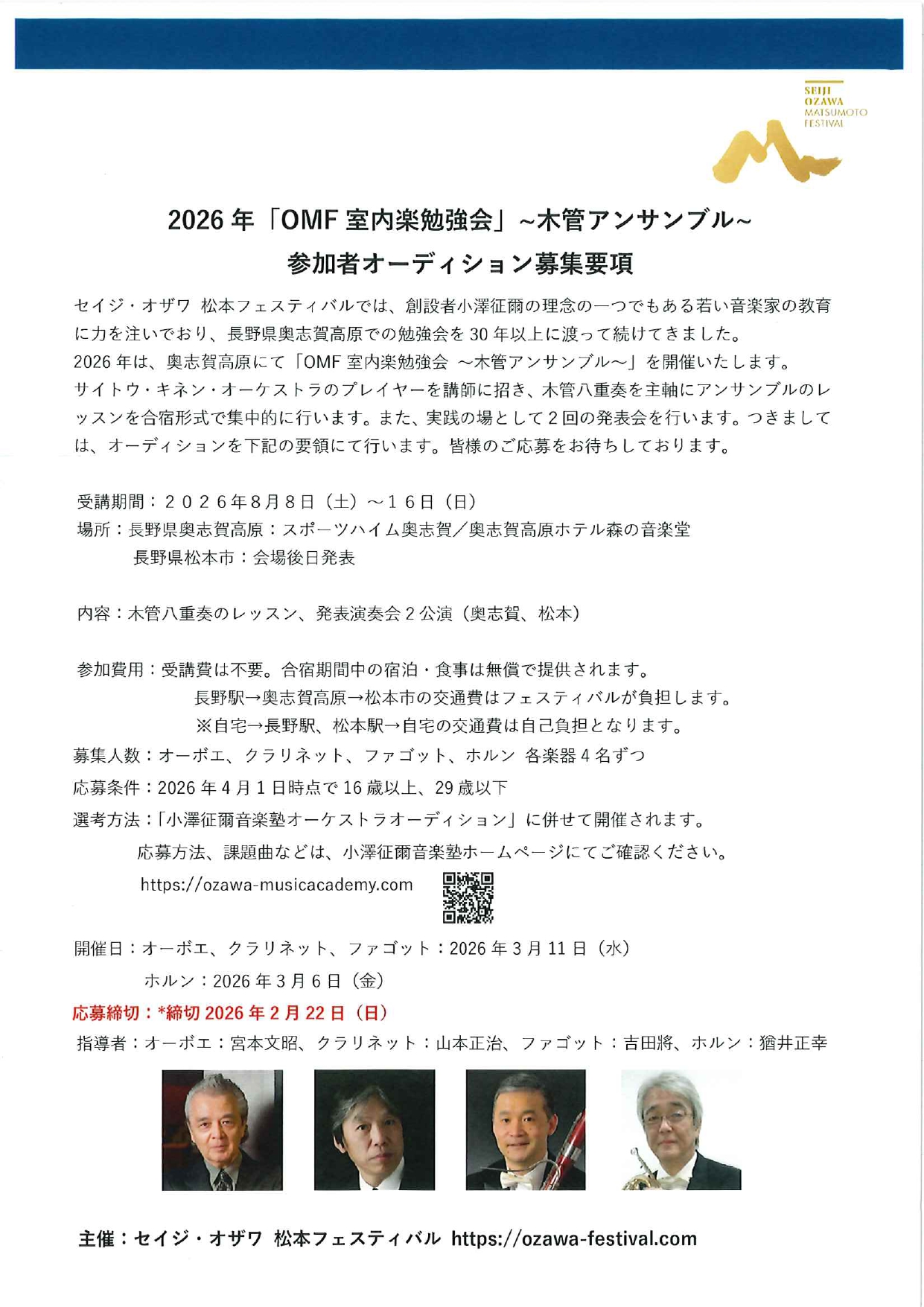 【木管】2026年「OMF 室内楽勉強会」 ~木管アンサンブル~ 参加者オーディション募集要項
