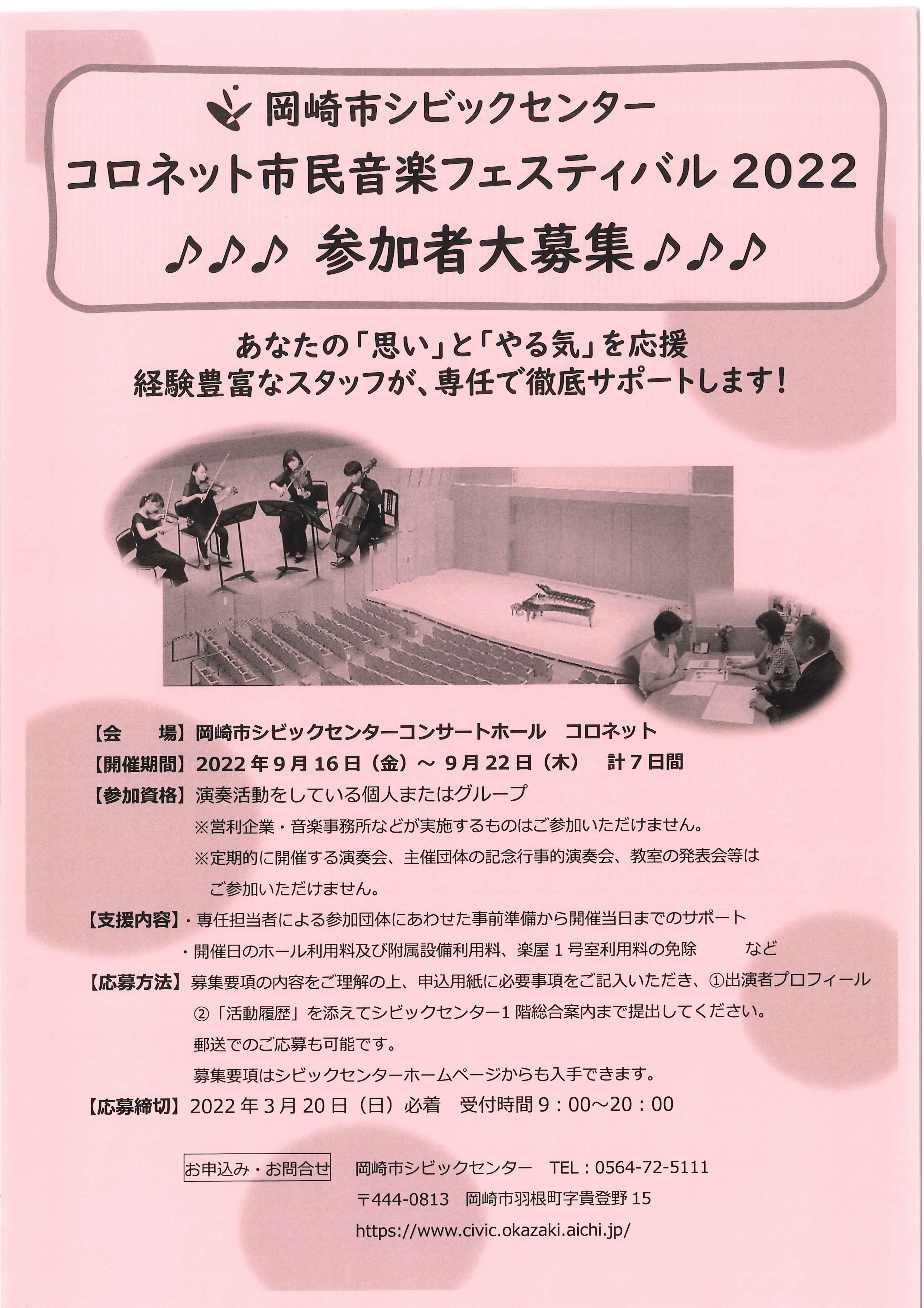 【共通】コロネット市民音楽フェスティバル2022 参加者募集(3/20〆切)