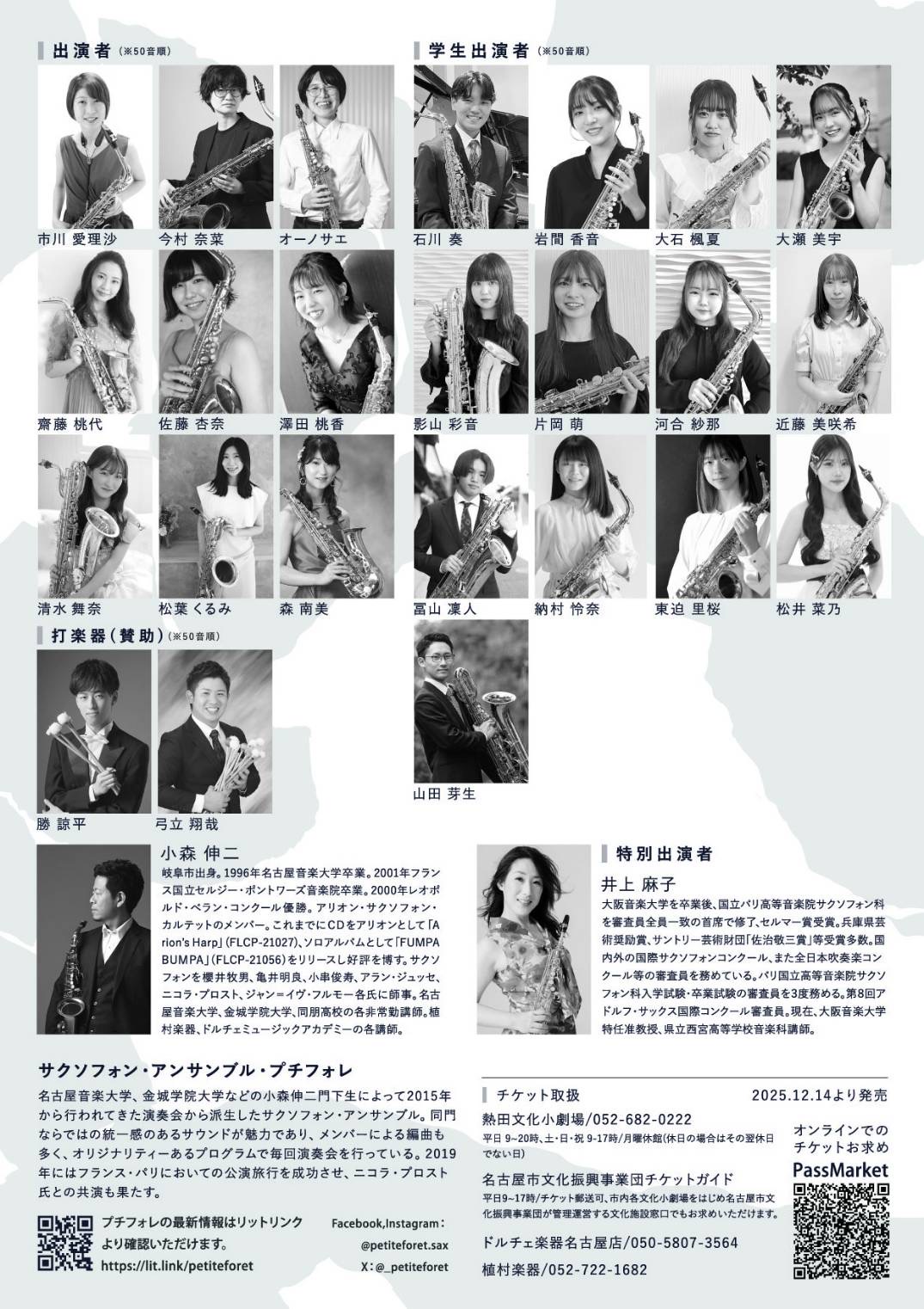 | 申込み先 | ※2025.12.14より発売 ■熱田文化小劇場 052-682-0222 平日9-20時、土・日・祝9-17時/月曜休館(休日の場合はその翌休日でない日) ■名古屋市文化振興事業団チケットガイド 平日9-17時/チケット郵送可、市内各文化小劇場をはじめ名古屋市文化振興事業団が管理運営する文化施設窓口でもお求めいただけます。 ■ドルチェ楽器名古屋 052-5807-3564 ■植村楽器 052-722-1682 |
