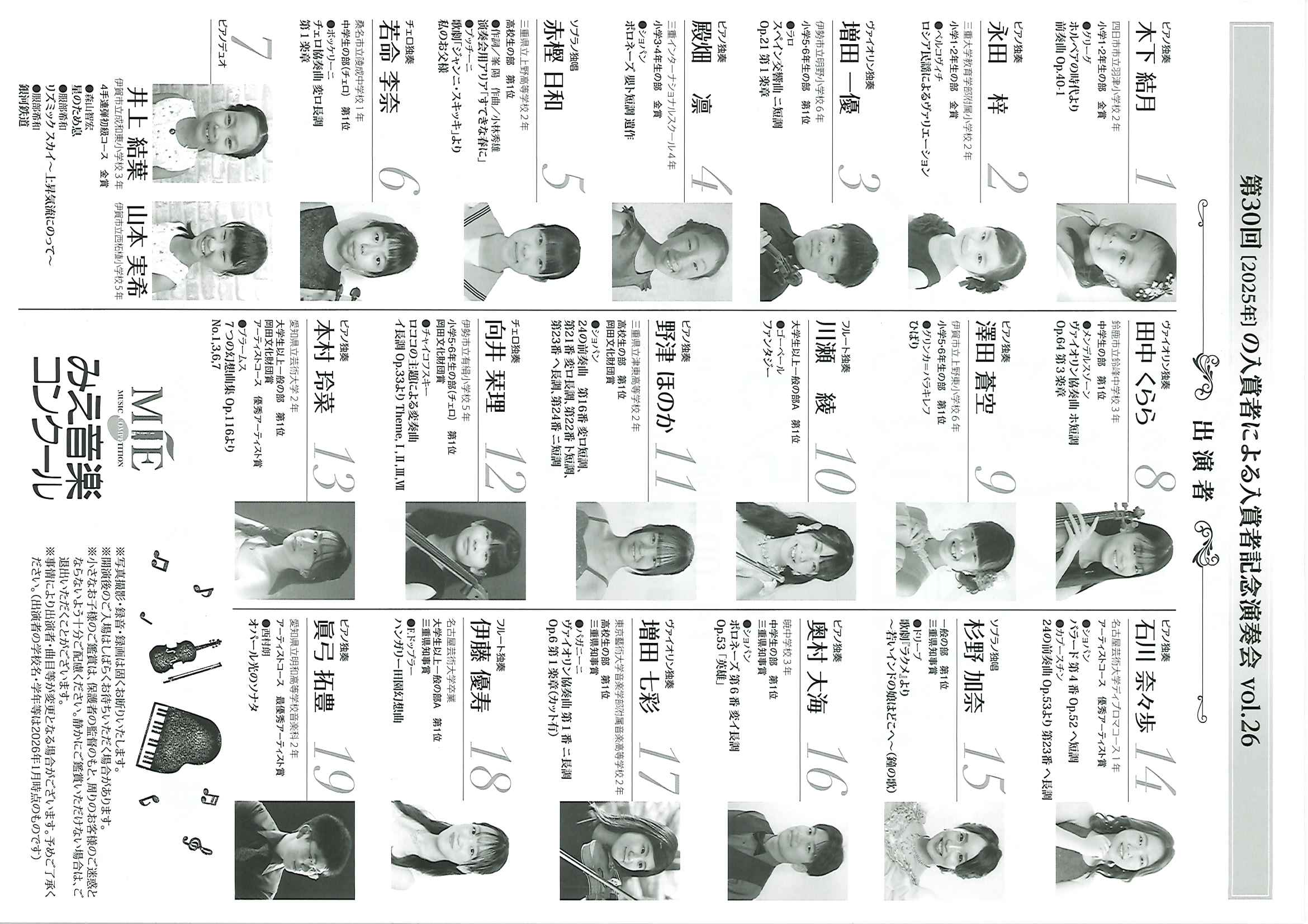 | 出演 | 【ピアノ部門】 独奏 木下結月 永田梓 殿畑凛 澤田蒼空 奥村大海 野津ほのか 本村玲菜 石川奈々歩 眞弓拓豊 デュオ 井上結葉 山本実希 【声楽部門】 独唱 赤樫日和 杉野加奈《卒業生》 【弦楽部門】増田一優 向井栞理 田中くらら 若命李奈 増田七彩 【フルート部門】 独奏 伊藤優寿 川瀬綾 |