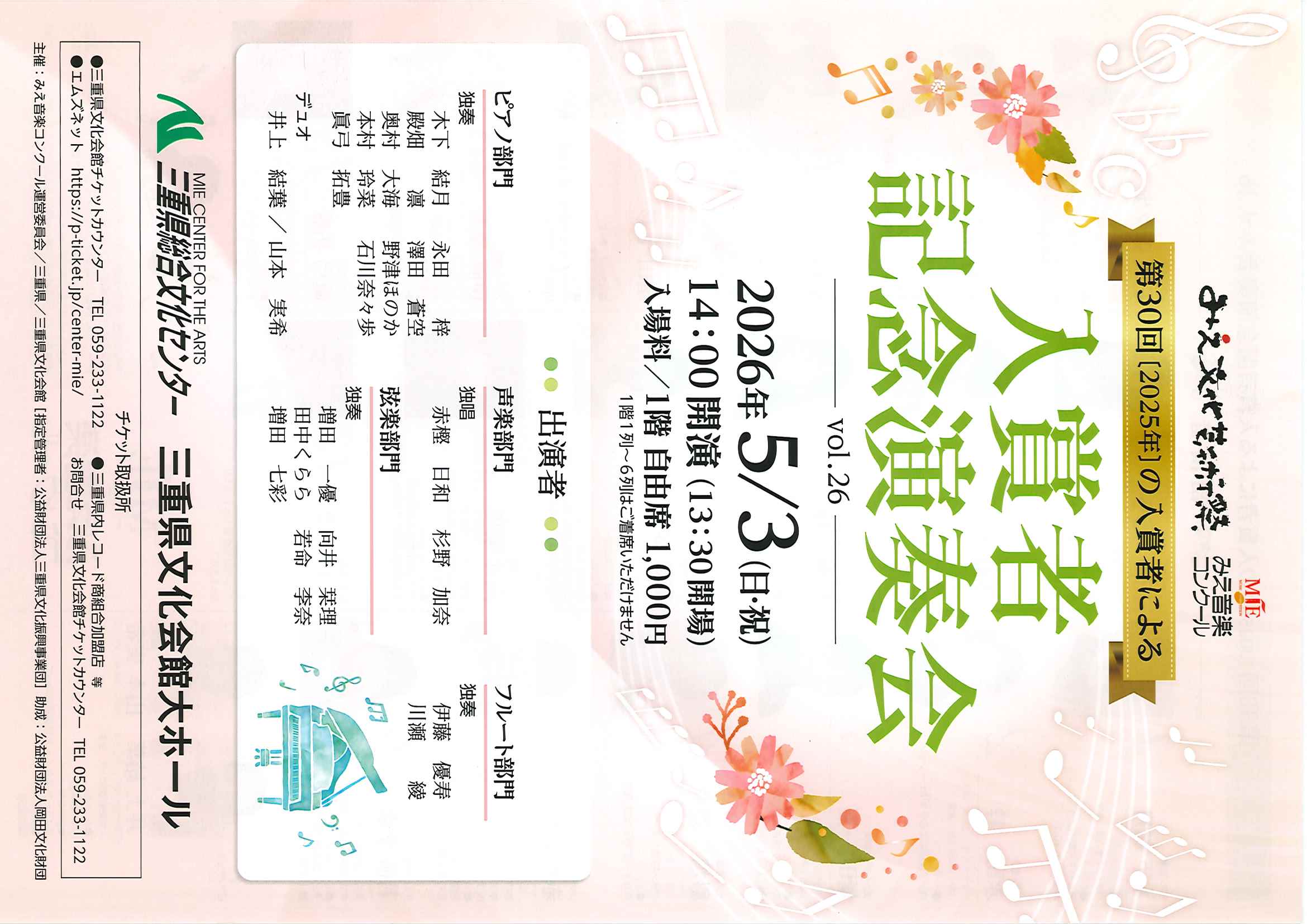 | 主催 | みえ音楽コンクール運営委員会/三重県/三重県文化会館[指定管理者:公益財団法人三重県文化振興事業団] 助成:公益財団法人岡田文化財団 |