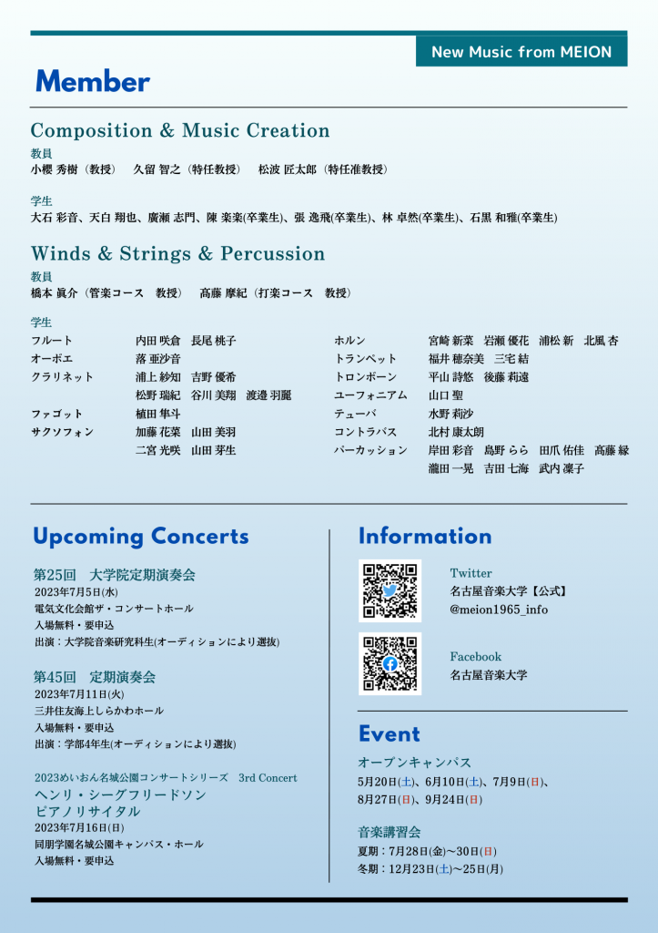 | 出演 | ●作曲・音楽クリエイションコース 小櫻 秀樹<教員> 久留 智之<教員> 松波 匠太郎<教員> 作曲・音楽クリエイションコース学生・卒業生(チラシ参照) ●管弦打楽コース 橋本 眞介<教員> 髙藤 摩紀<教員> 管弦打楽コース生(チラシ参照) |