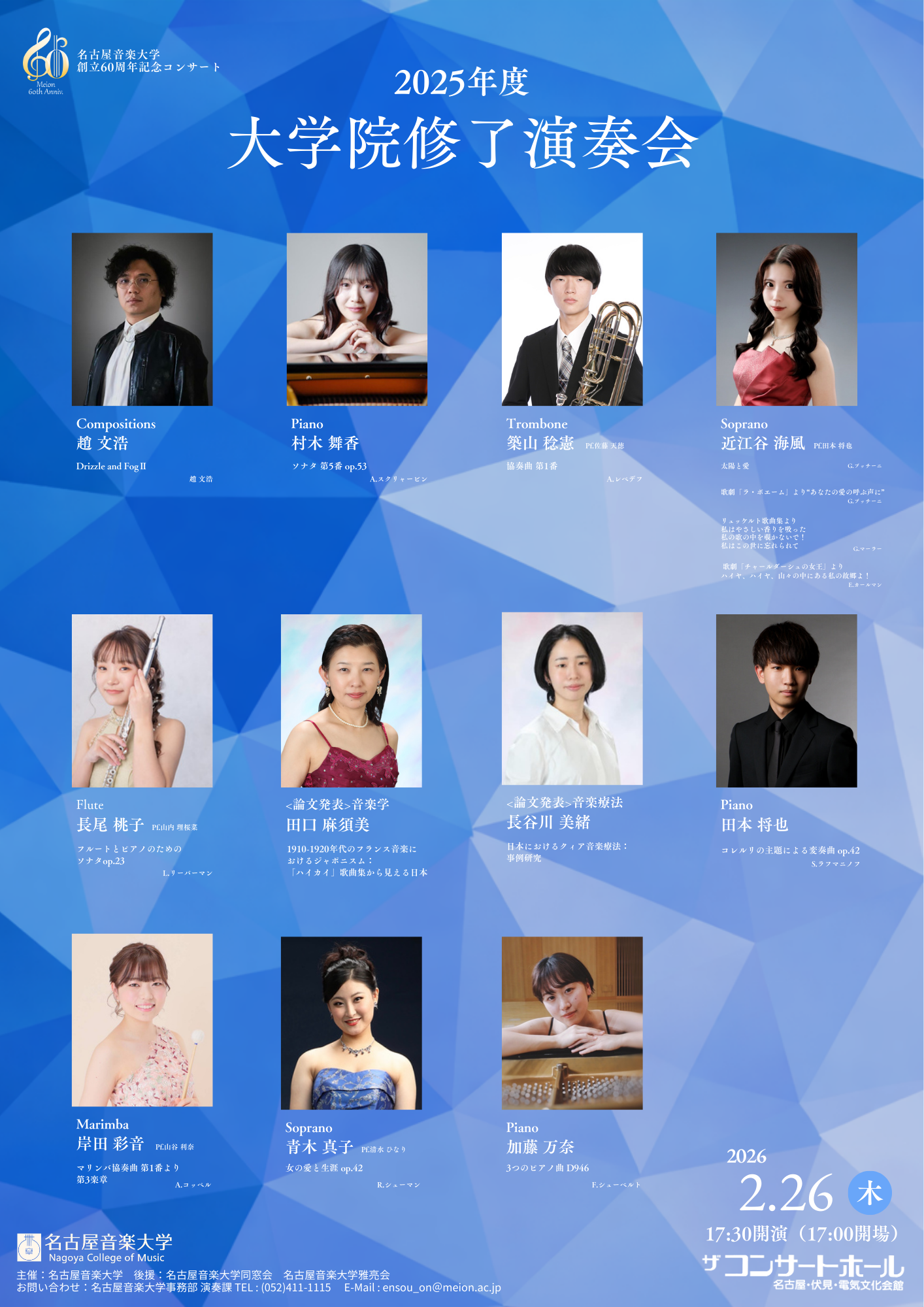 | お問い合わせ | 名古屋音楽大学 事務部 演奏課 〒453-8540 愛知県名古屋市中村区稲葉地町7-1 TEL:052-411-1115(平日9:00~17:00) FAX:052-411-4124 Mail:ensou_on@meion.ac.jp |