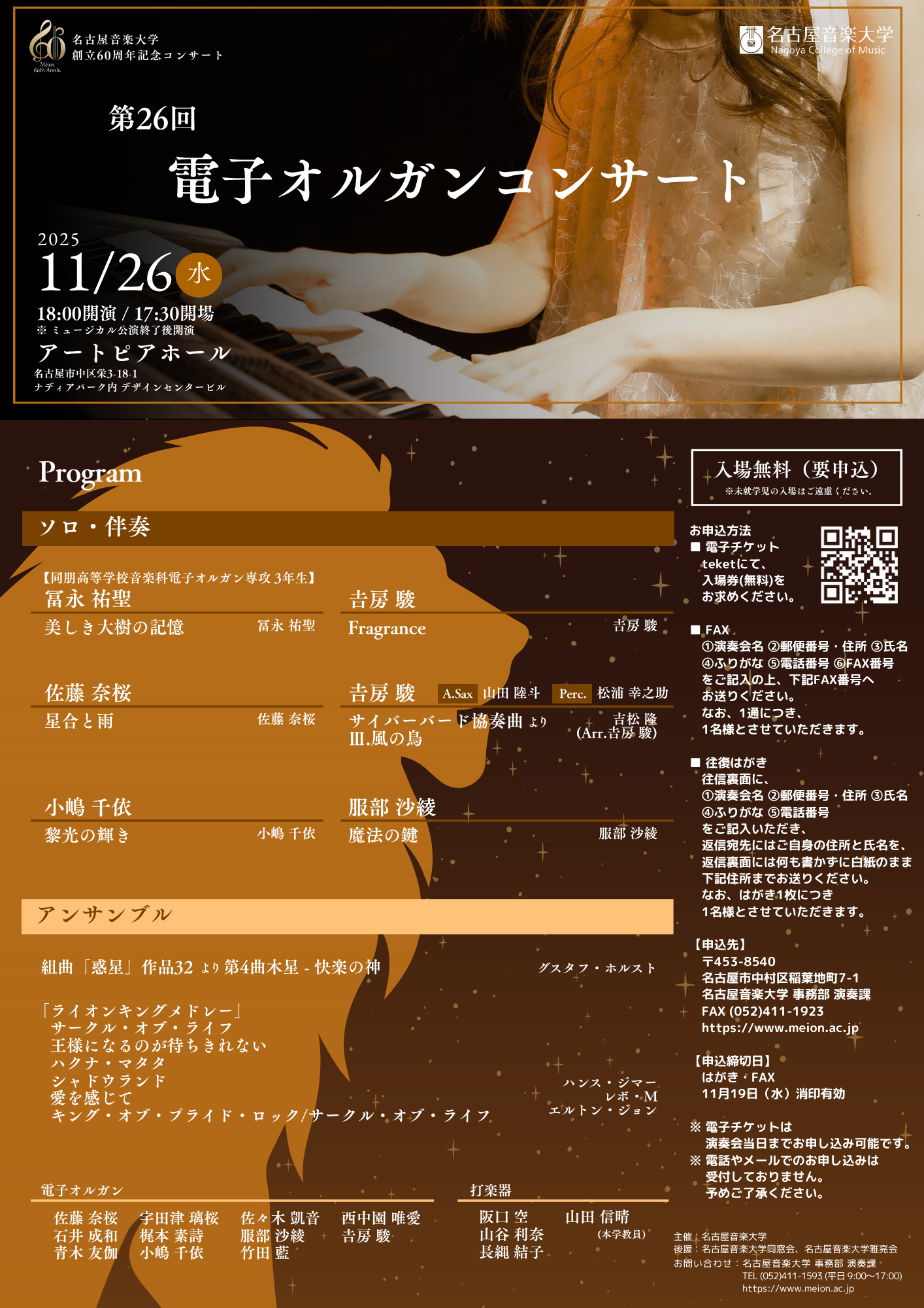 | プログラム出演者 | ■ソロ 冨永 祐聖 (同朋高等学校音楽科電子オルガン専攻 3年生) 美しき大樹の記憶 / 冨永 祐聖