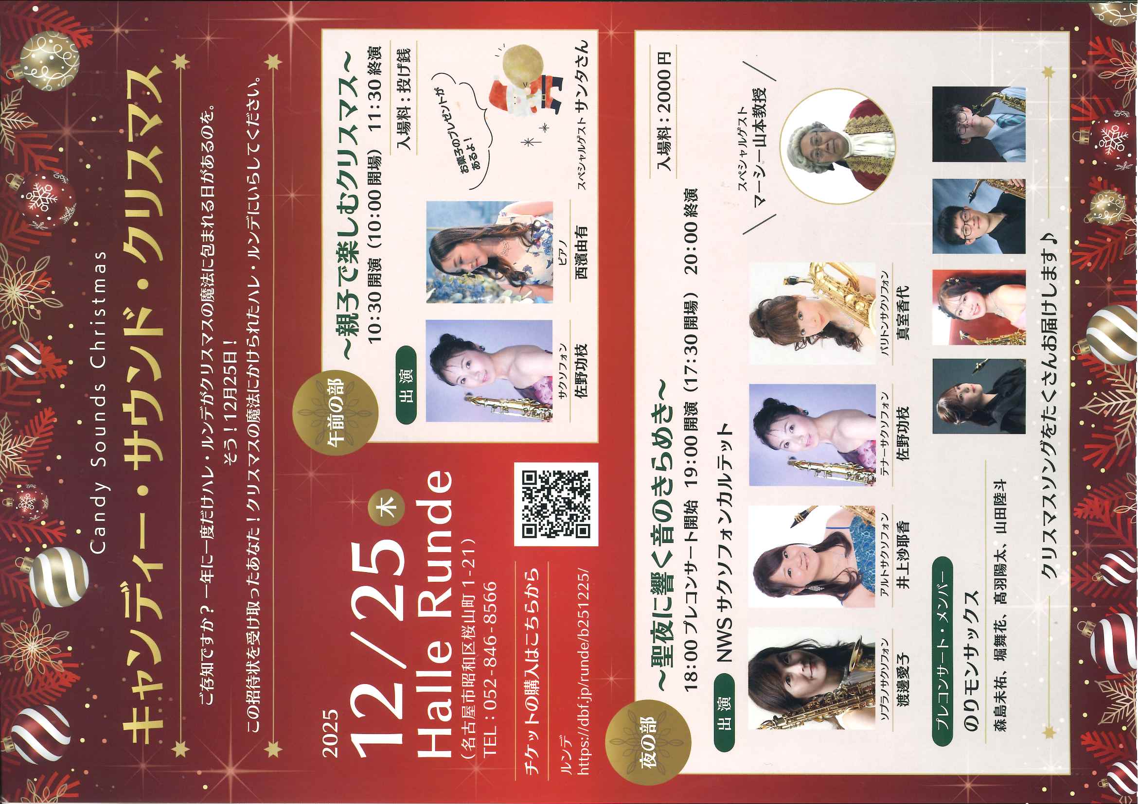 | 出演 | ■昼の部 <サクソフォン>佐野功枝《本学教員》 <ピアノ>西濱由有 ■夜の部 NWSサクソフォンカルテット <ソプラノサクソフォン>渡邊愛子 <アルトサクソフォン>井上沙耶香 <テナーサクソフォン>佐野功枝《本学教員》 <バリトンサクソフォン>真室香代 プレコンサート・メンバー 森島未祐《本学学生》 堀舞華《本学修了生》 高羽陽太《本学卒業生》 山田陸斗《本学学生》 |