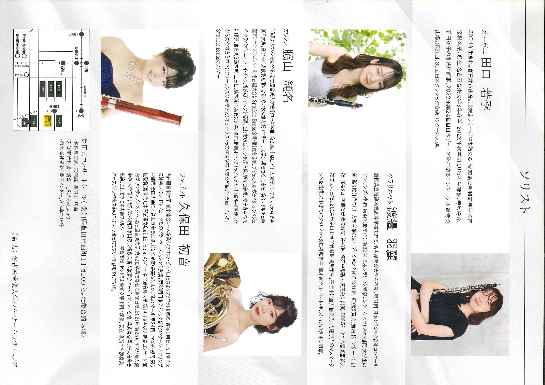 | 出演 | 指揮:鈴木淳 オーボエ:田口若季《学生》 クラリネット:渡邉羽麗《卒業生》 ホルン:脇山純名《卒業生》 ファゴット:久保田初音《卒業生》 【ゲスト奏者】 コンサートマスター:島田真千子《本学教員》 第二ヴァイオリン:向吉彩華 ヴィオラ:山内佑太 チェロ:山田真吾 コントラバス:高柳安佐子 |
