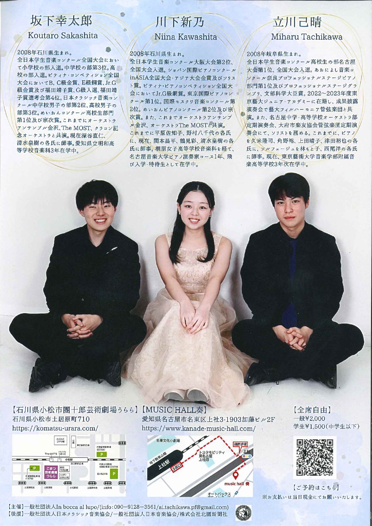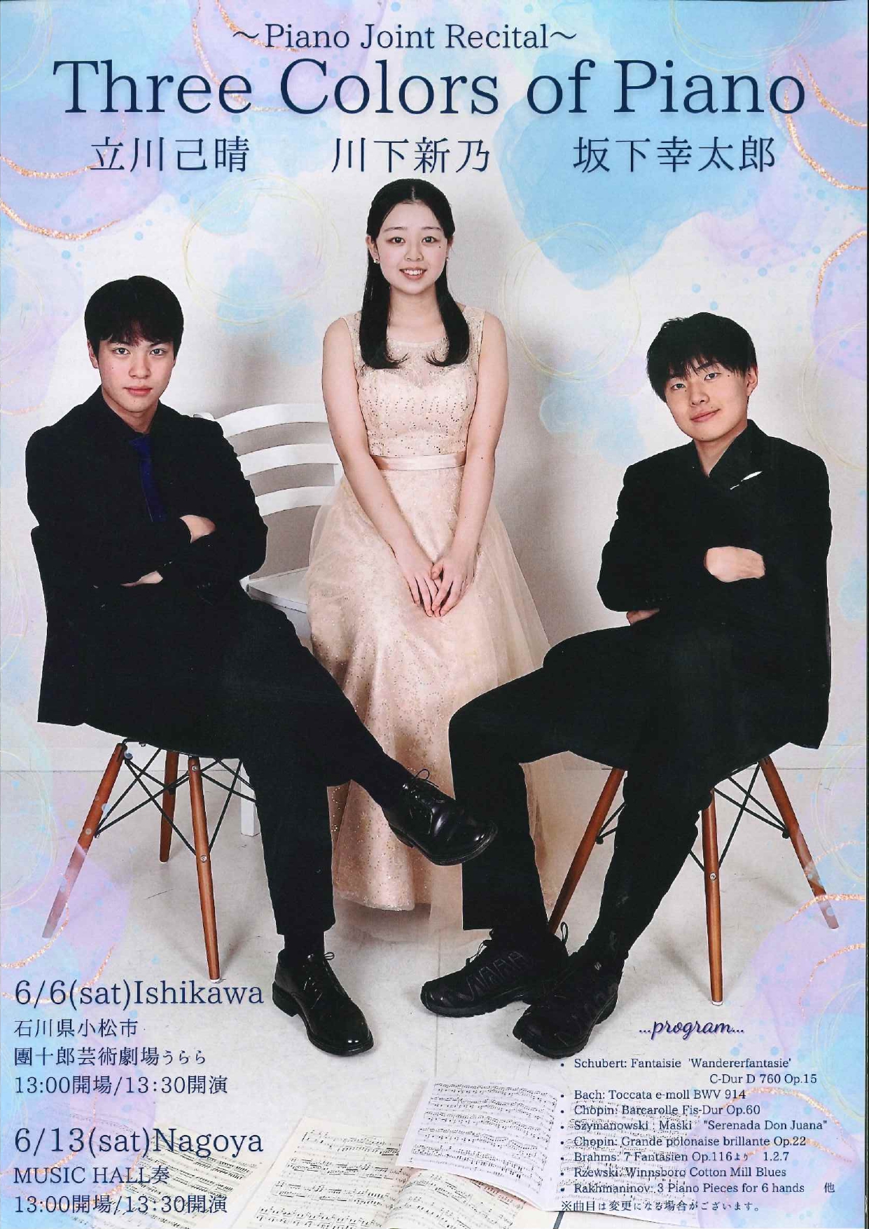 | プログラム | Schubert : Fantaisie ‘Wandererfantasie’ C-Dur D 760 Op.15 Bach : Toccata e-moll BWV 914 Chopin : Barcarolle Fis-Dur Op.60 Szymanowski : Maski “Serenada Don Juana” Chopin : Grande polonaise brillante Op.22 Brahms : 7 Fantasien Op.116 より 1.2.7 Rzewski :Winnsboro Cotton Mill Blues Rakhmaninov : 3 Piano Pieces for 6 hands