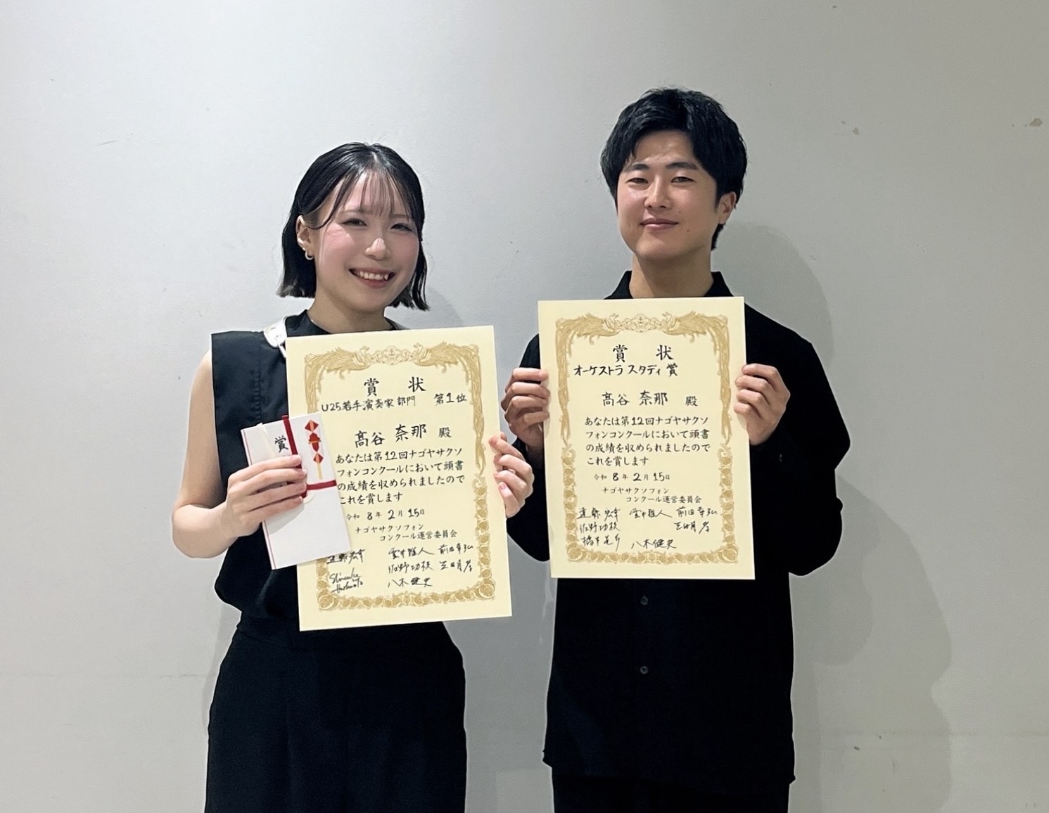 管楽コース4年(受賞時は3年) 髙谷 奈那さん(サクソフォーン、写真左)が