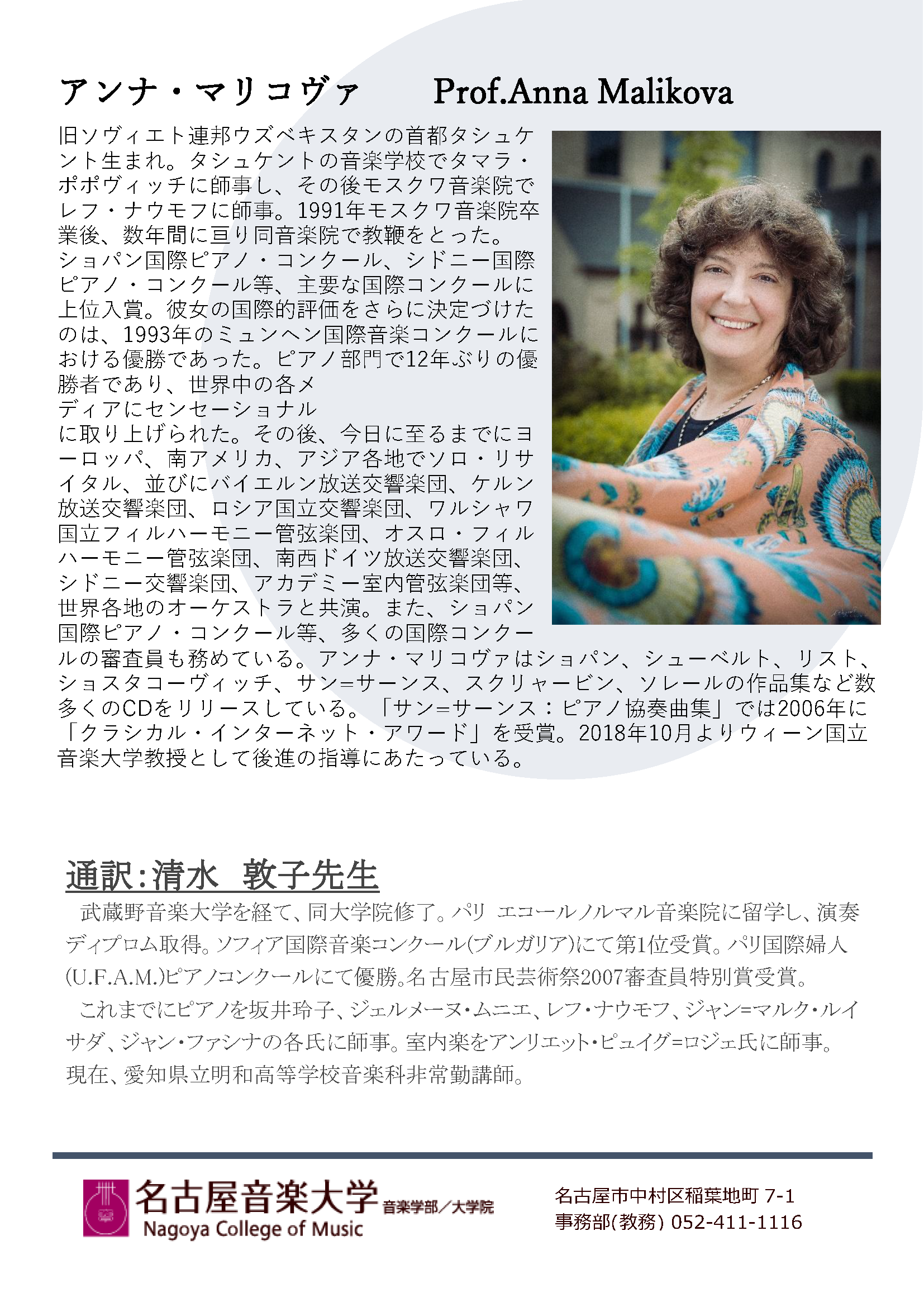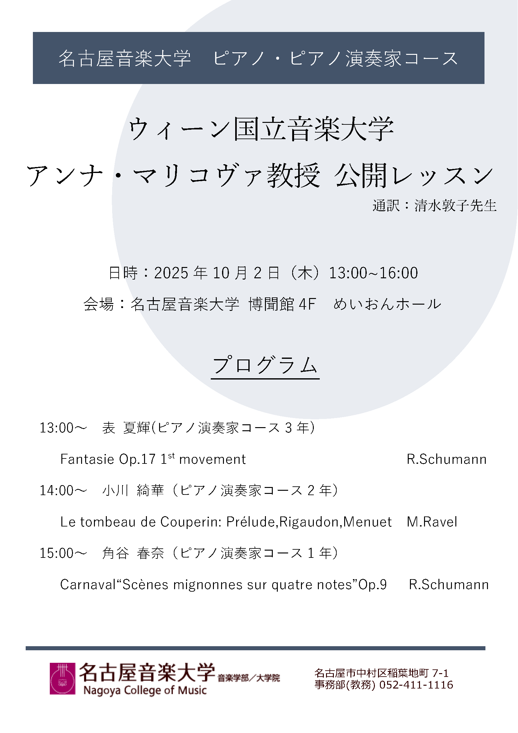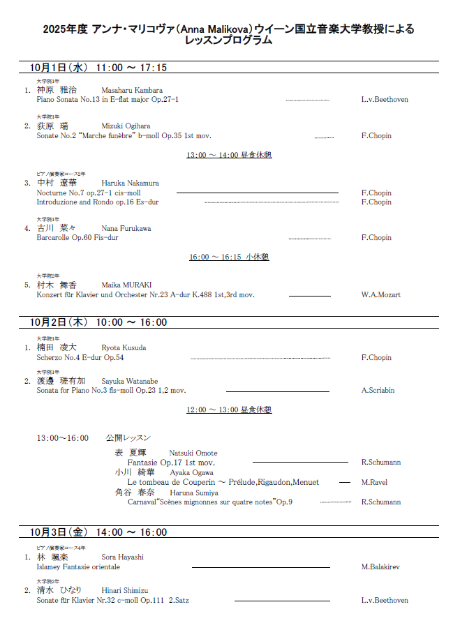 2025年10月1日(水)から3日(金)まで、アンナ・マリコヴァ先生(ウィーン国立音楽大学教授)による大学院科目:ピアノ作品研究Aおよびピアノ・ピアノ演奏家コース公開レッスンが開催されました。