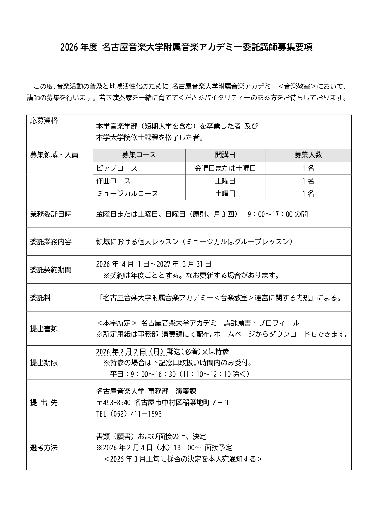 2026年度 名古屋音楽大学附属音楽アカデミー委託講師募集要項