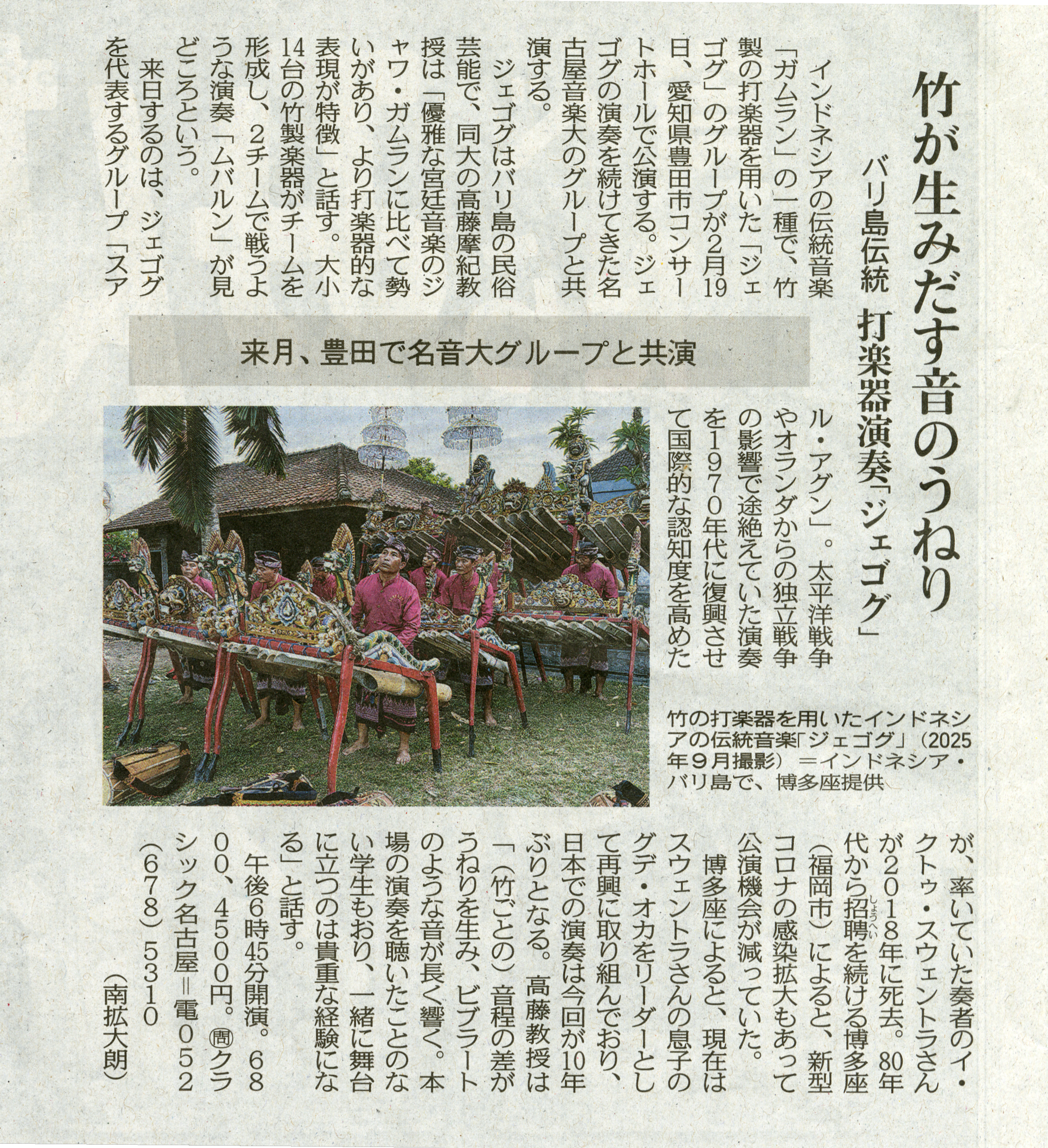 インドネシアの伝統音楽「ジェゴグ」の共演が、1月7日の中日新聞 夕刊に掲載されました。
